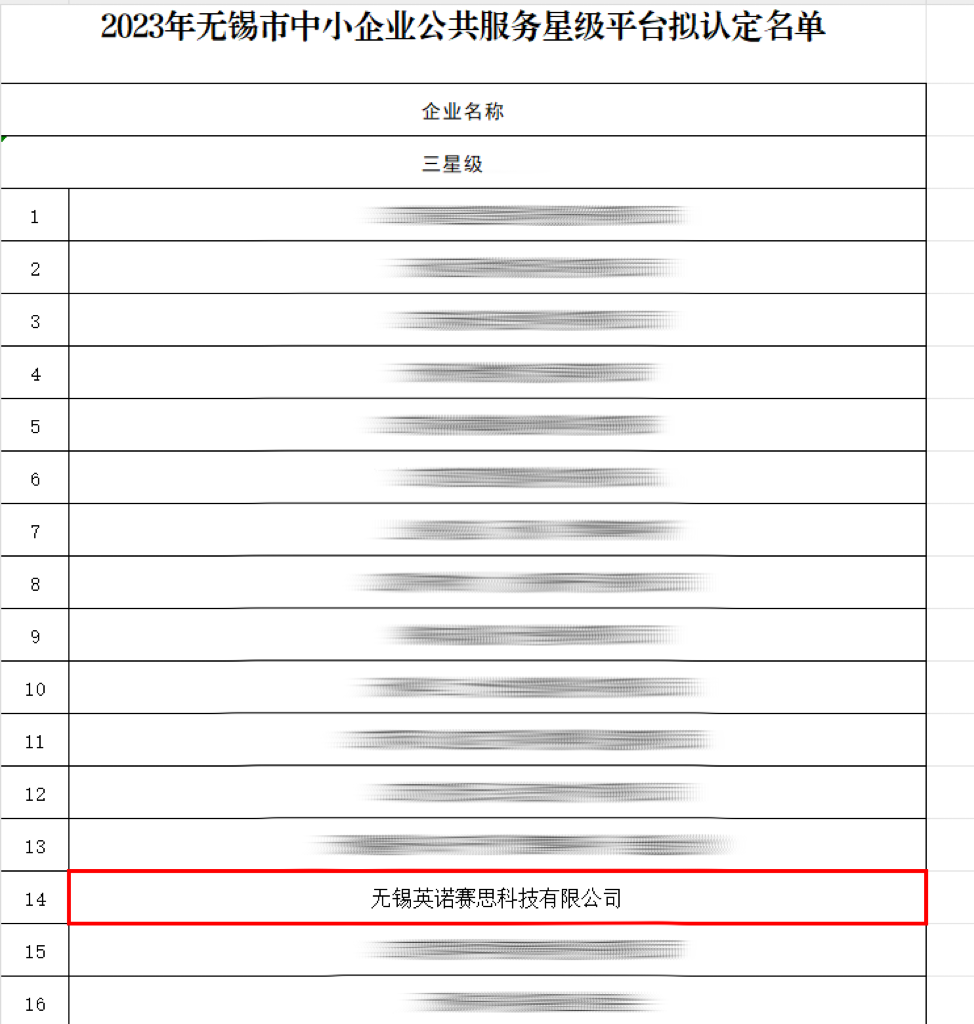 12月7日,無錫市工業和信息化局公示了《2023年無錫市中小企業公共服務星級平臺認定名單》,無錫英諾賽思科技有限公司榮列榜單,被認定為三星級平臺。