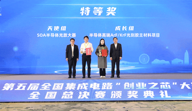 經(jīng)過大賽評審專家組評選,《SOA半導體光放大器項目》獲得天使組特等獎,《半導體高端ArF/KrF(氟化氬/氟化氪)光刻膠主材料項目》獲得成長組特等獎;《面向5G工業(yè)物聯(lián)、車聯(lián)網(wǎng)和衛(wèi)星互聯(lián)網(wǎng)通信芯片項目》《植入式神經(jīng)調(diào)控芯片項目》獲得天使組一等獎,《炎黃國芯-宇航及高可靠領域高性能自主可控模擬芯片項目》《芯片可靠性應用驗證評測項目》獲得成長組一等獎。